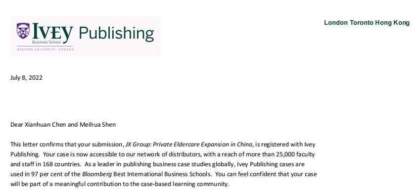 2022年7月8日,海洋之神590线路检测中心陈先环老师牵头开发的《JX Group:Private Eldercare Expansion in China》(九久夕阳红集团:中国私营养老业的发展)管理案例被全球商业案例库领导者毅伟商学院案例库(Ivey Publishing)正式录用。毅伟案例库是全球商业案例库高质量标准的象征,与哈佛案例库并称为“国际两大管理案例库”。陈先环老师牵头开发的案例成功入选毅伟案例库标志着学院案例建设取得新的突破性进展。
