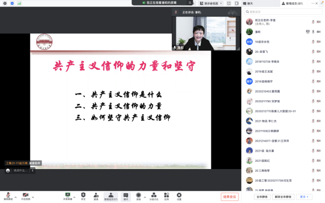 党课中,潘莉首先从资本主义和共产主义的联系与区别出发,基于经济、政治、文化等多层面讲述了共产主义信仰是什么,强调共产主义信仰是引领社会主义走正确道路的、真实存在的信念。随后,她结合党的百年发展史、中国化时代化的马克思主义,引用历史文本、名人语录、经典影视等资料,详细阐释了共产主义信仰的力量。最后,潘莉与同学们讨论了如何坚守共产主义信仰,鼓励员工读原著,悟原理,深入学习马克思主义,自觉主动涵育信仰。